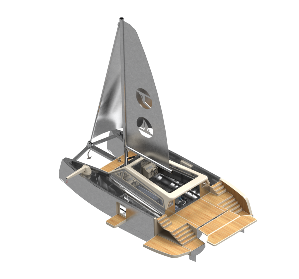 Chaque élément est positionné de manière à offrir une vue claire de l’intégration possible à bord d’un véritable catamaran.